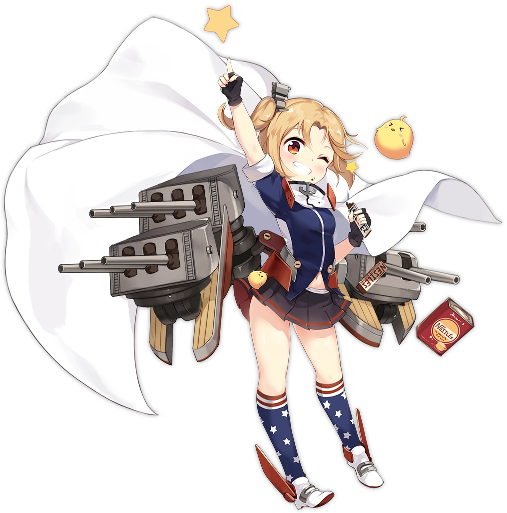 Decrease this ship's DMG taken by 4.5% (12%) when sortied in the frontmost position in the Vanguard. When sortied with Li'l Sandy or Lena: decrease the Main Gun DMG they take by 8%.